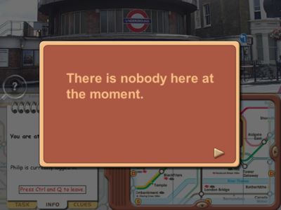 You can return to the surface at any station, but unless you're caught up to one of your witnesses there's little point in doing so. Your only option for interaction is the magnifying glass at the lower-left which occasionally provides a photo and a few sentences describing the local tourist attractions, but more often informs you rather bleakly that "There is nobody here at the moment". Should you be in the right location you'll encounter a random witness who will provide you with a clue.
